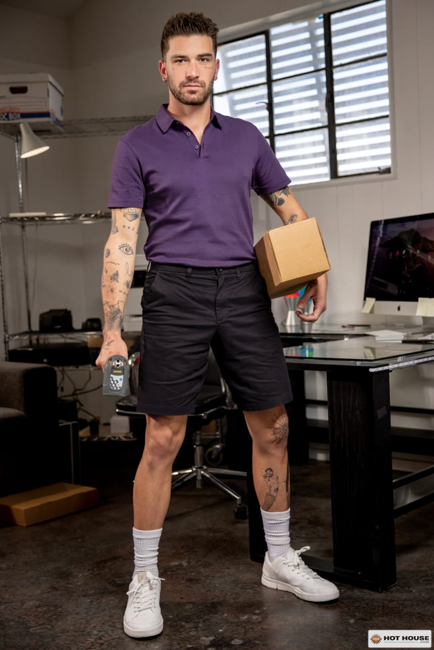 This is the second scene from the Hot House movie “Capitol Affairs“. Adrian Hart says he’s watching the inauguration, but he’s really watching porn when delivery man Chris Damned shows up to drop off some packages.