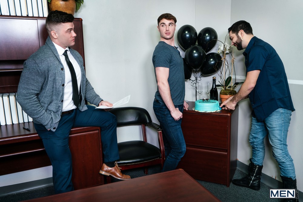 Horny lawyer Collin Simpson fucks Michael Boston in “The Divorce Party“. A gay divorce isn’t a sad occasion, it’s a celebration, so Michael Boston and his soon-to-be ex brought a cake and some bubbly to lawyer Collin Simpson‘s office. Before the papers are even signed, Michael is ready to move on.