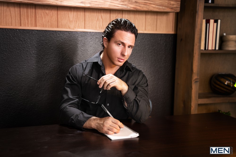 Reese Rideout then lubes up his big cock and slides it slowly inside gorgeous Michael Boston’s eager hole, as Michael keeps deep-throating Collin Simpson’s dick. The three studs then switch positions and Michael starts riding Collin’s thick cock on top of Reese’s desk as Collin gets face-fucked by Reese.