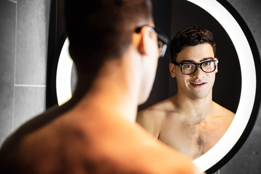 Back at home, Dean Dallas does a sexy tease on the bed in his swimsuit, and Roman Todd joins him. Standing in the mirror and pulling down his trunks to show his hard cock and sculpted ass.
