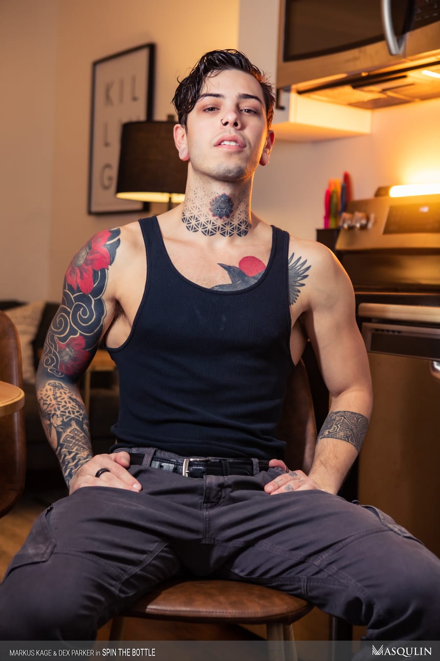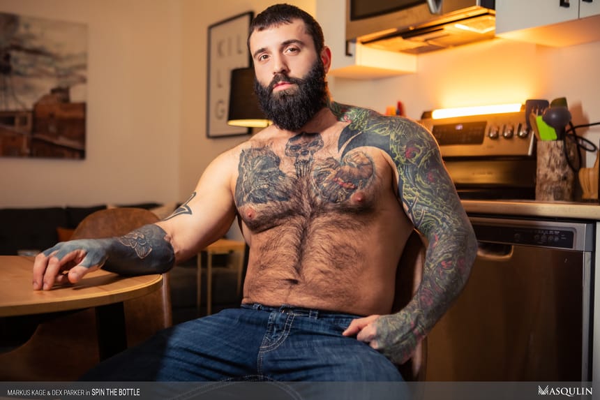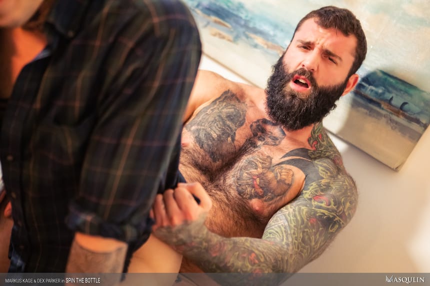 This week’s hardcore scene from Masqulin is called “Spin The Bottle“. Tattooed hottie Dex Parker – who recently appeared in a POV-style Sean Cody video – makes his Masqulin debut. He has been paired up with hairy top Markus Kage.