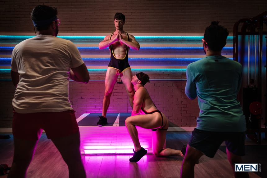 This Men.com update – starring Finn Harding and Michael Boston – is called “Bootycamp“. It’s Michael’s first time at the Bootycamp workout class. His assless onesie draws some stares from the other participants, but only until ripped instructor Finn starts things off with some jumping jacks and squats.