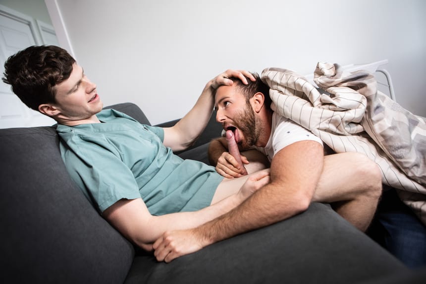 Tanner Hall brings home his boyfriend, Ryan Jacobs, for a visit to his sick dad, but the horny couple is more interested in getting to know hot healthcare worker Finn Harding. Finn flirts with Tanner but snubs Ryan, then takes a break to sneakily stroke his cock on the couch.
