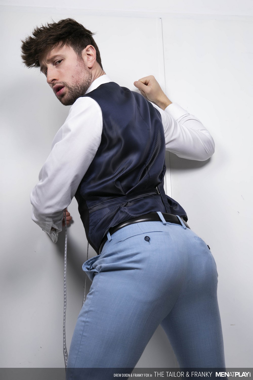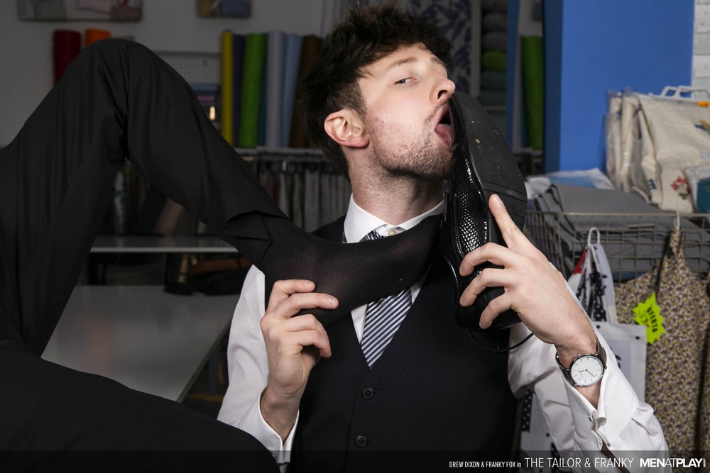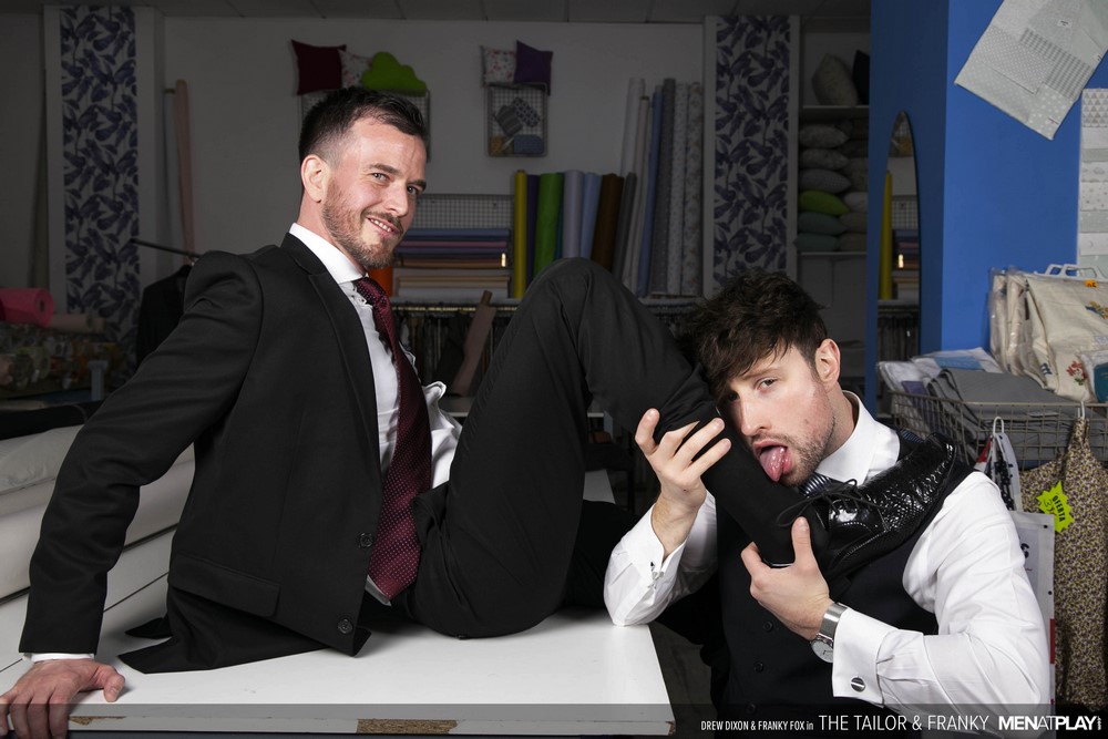 Hunks in suits, bareback action, foot play and a creamy facial… that’s what Men At Play serves us in “The Tailor & Franky“. Sexy tailor Drew Dixon is at his atelier when Franky Fox stops by to check-in on his progress.