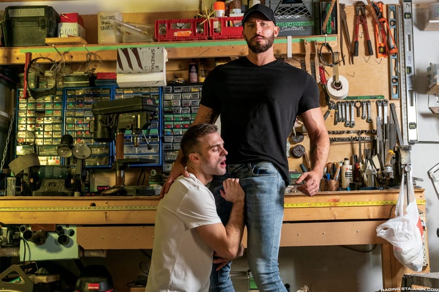 This is the fourth scene from the Raging Stallion movie “Fuck Me Fast & Furious“. Mechanic Travis Connor just caught Gabriel Clark sabotaging his team’s racecar.