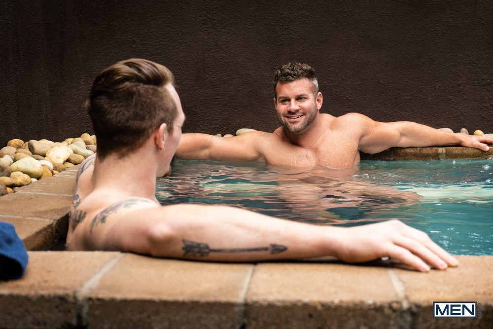 This is the third scene from the “Love Tub” mini-series. The guys from the Men.com Network have paired up Jackson Cooper and Mason Max. The latter one has heard great things about the magic of the Love Tub, and he’s so excited to hop in that he has a hard time relaxing.