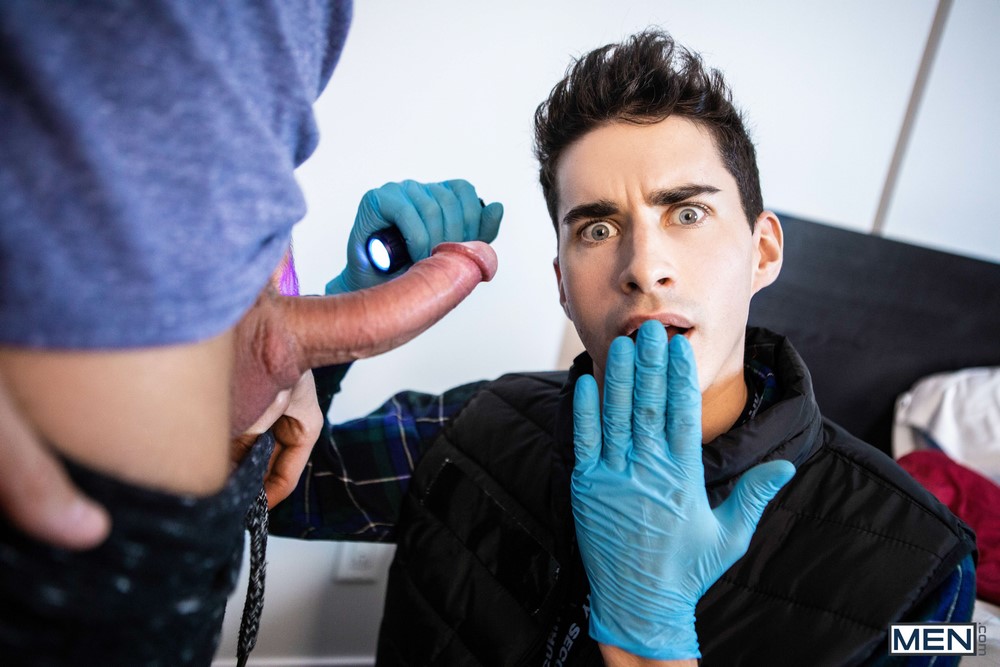 The Sticky Sadist has struck again, jizzing all over Raphael Louis‘ roommate’s underwear, and CSI Jake Nobello is here to check it out. The Cum Spotter Investigator has never seen anything like this as he shines his UV light around the semen-streaked room, and the still-wet trail of cum leads him directly to the perp… Raphael!