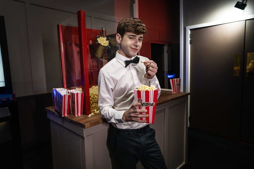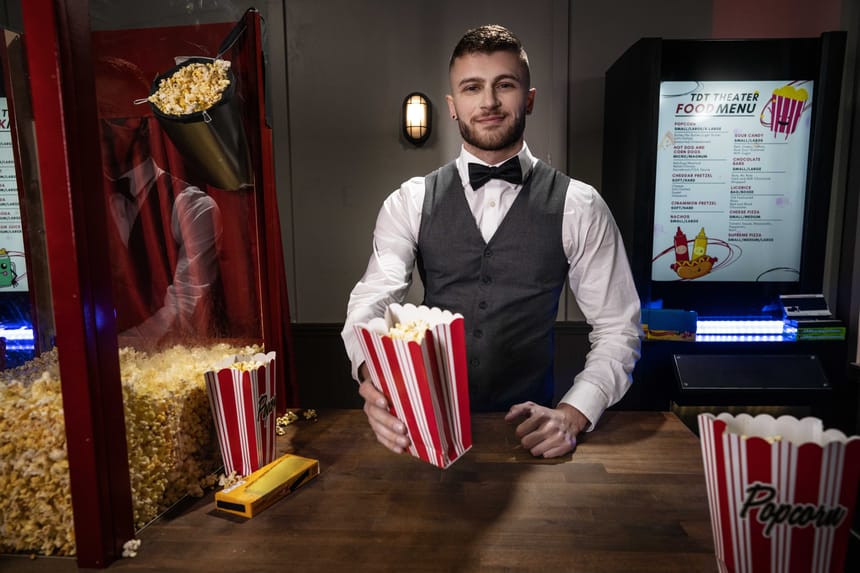 Joey Mills returns in the second part of “Buttering His Popcorn“. The Men.com exclusive has found himself a job at the movie theater. It’s his first day working concessions, and he immediately flirts with his new coworker, Devy.