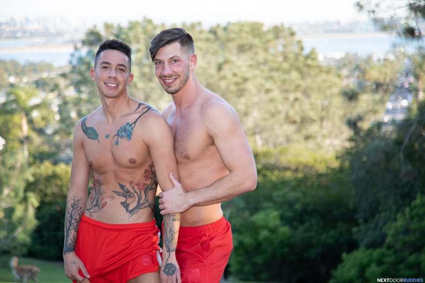 The scene starts with the shirtless guys working out in a park. Once Jordan Starr and Vincent O’Reilly head inside, they cannot control themselves anymore. They kiss and strip out of their shorts.
