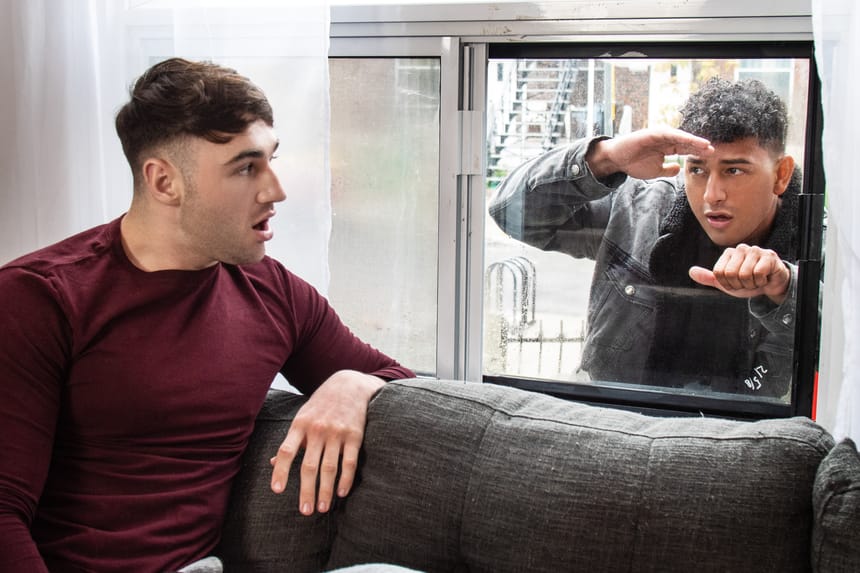 This hot Men.com release – called “Cheating For Dummies” – brings together Kenzo Alvarez, Clark Delgaty, and Michael Boston. While Michael’s husband Clark works out in the other room, his sidepiece Kenzo climbs in the window, begging for just five minutes with him!