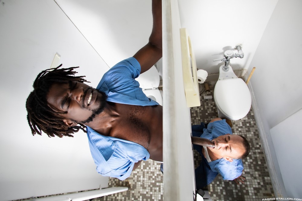 Kirk Cummings follows him and goes into the stall next to Devin’s. Kirk watches Devin Trez stroke his massive dick before Devin slides it thru the glory hole and is met by Kirk’s warm mouth. Thru the glory hole, Kirk does his best to get down to the base of Devin’s pole without gagging.