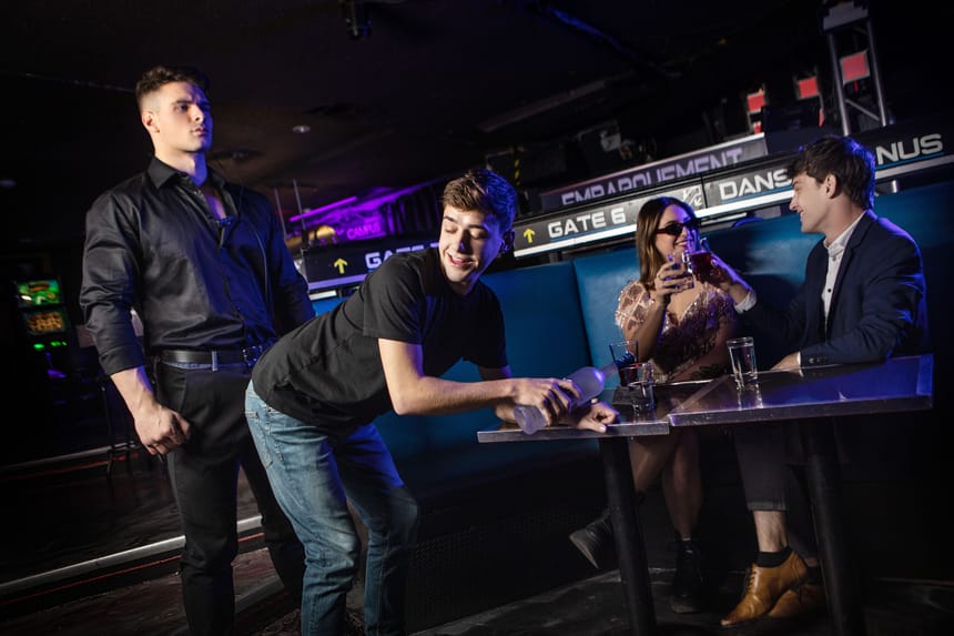 Dedicated bodyguard Malik Delgaty accompanies his client when she goes to a club for a night out. The handsome hunk assesses all possible threats, including giving cocktail waiter Joey Mills a very thorough pat-down.