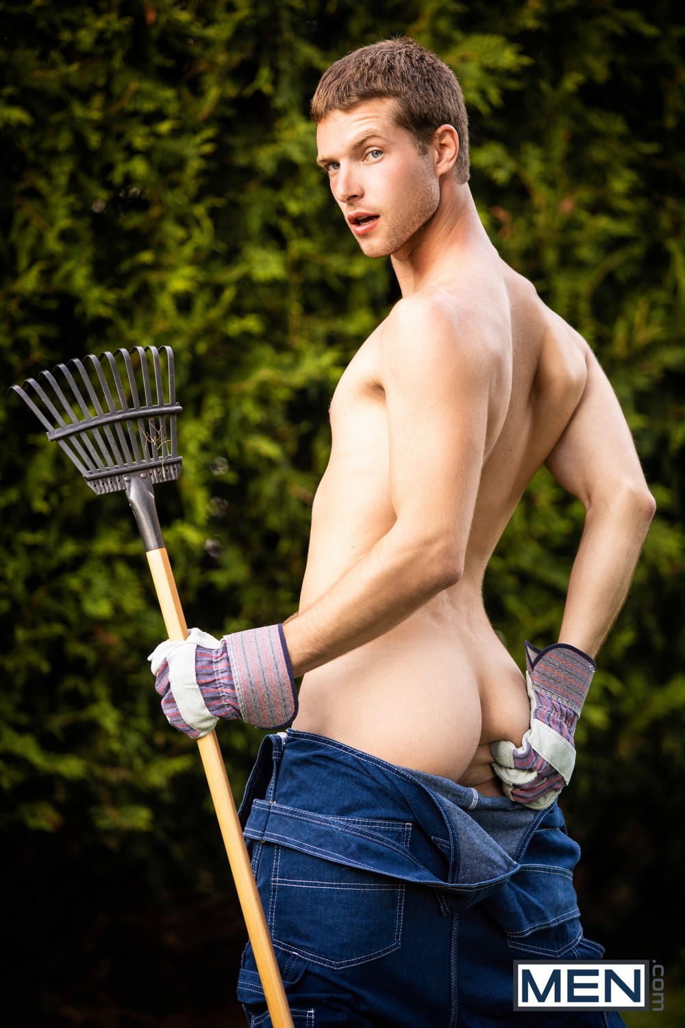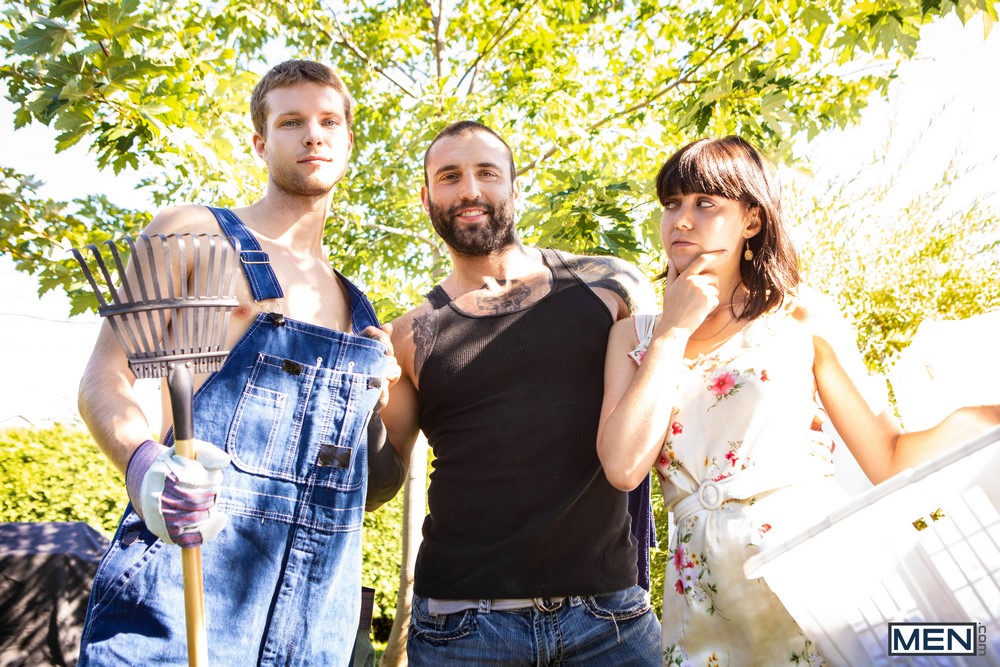 While his wife hangs out the sheets to dry, Markus Kage finds gardener Benjamin Blue hard at work… that is, his cock is hard as he works the handle of a rake in and out of his ass! Markus gets his dick out for the slacking gardener to suck, then bends Benjamin over and fucks him from behind.