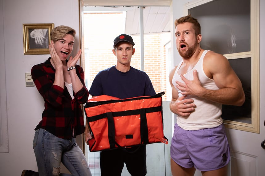 Annoyed that Olivier tells him to sneak out the window instead of finally being honest, Theo pretends to be a food delivery guy with a bag full of dick.