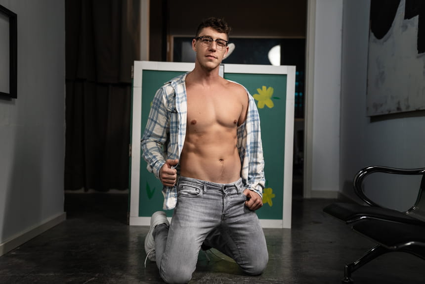 This hot scene from Men.com – called “Glory Hole Abstraction” – brings porn legends Paul Canon and Pierce Paris together. Paul might rather have stayed home to watch the game than come to an art gallery with his girlfriend.