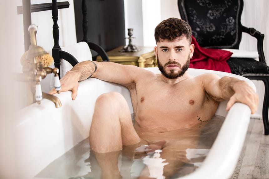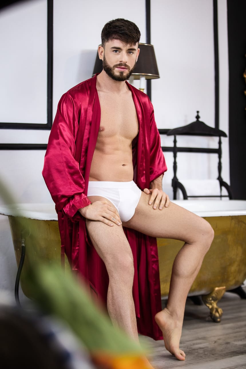This Men.com release – called “Rub In The Tub” – links up Pol Prince and Manuel Reyes. The latter one takes off his red satin robe and slips into his clawfoot tub for a nice relaxing soak.