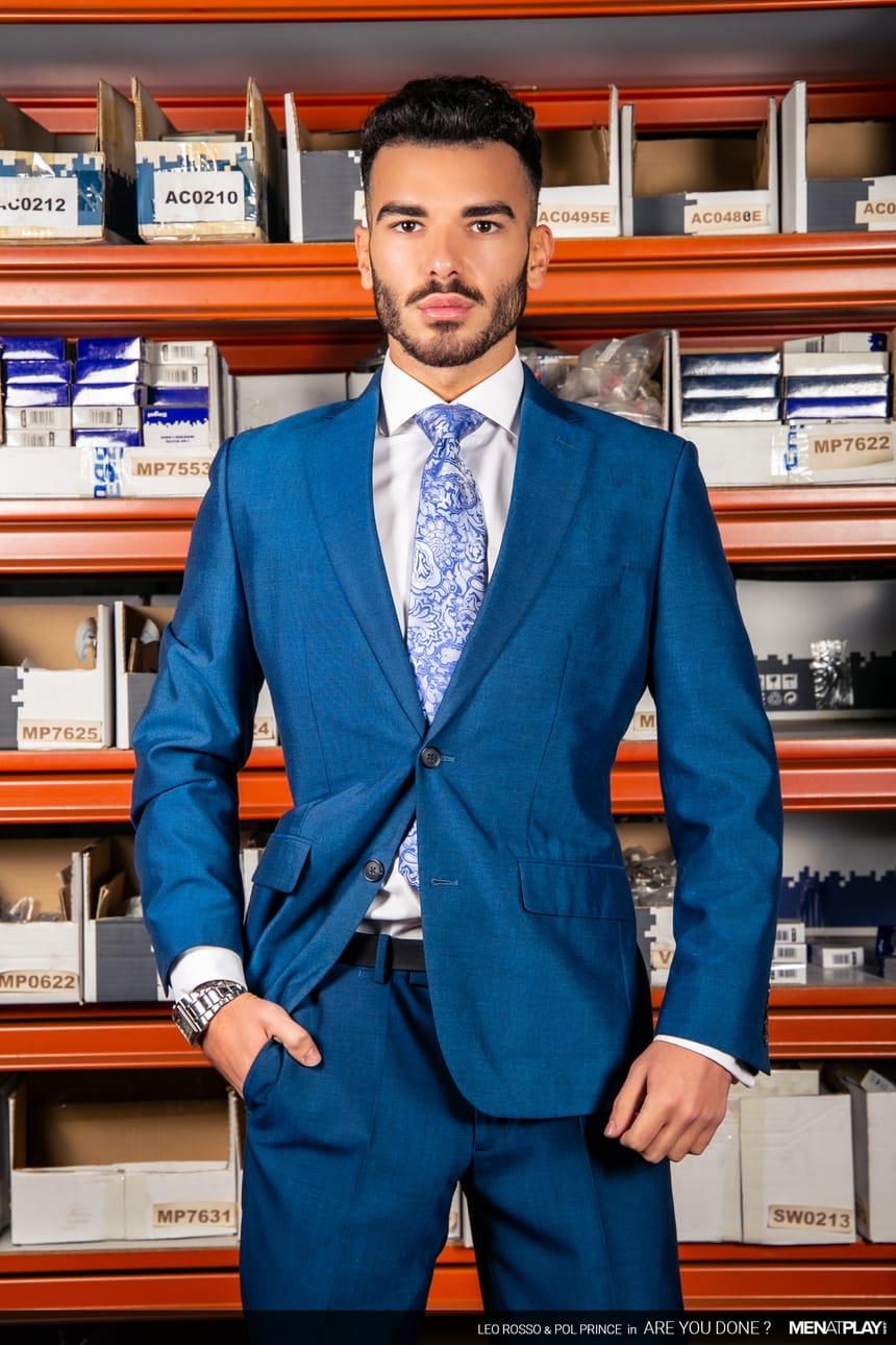 While Leo denies everything – Pol knows and likes what he saw! He likes them big and wants to taste and ride the boss’ thick cock. Leo wants to work less and play more too – the two suited studs flip-flop fuck in the warehouse.