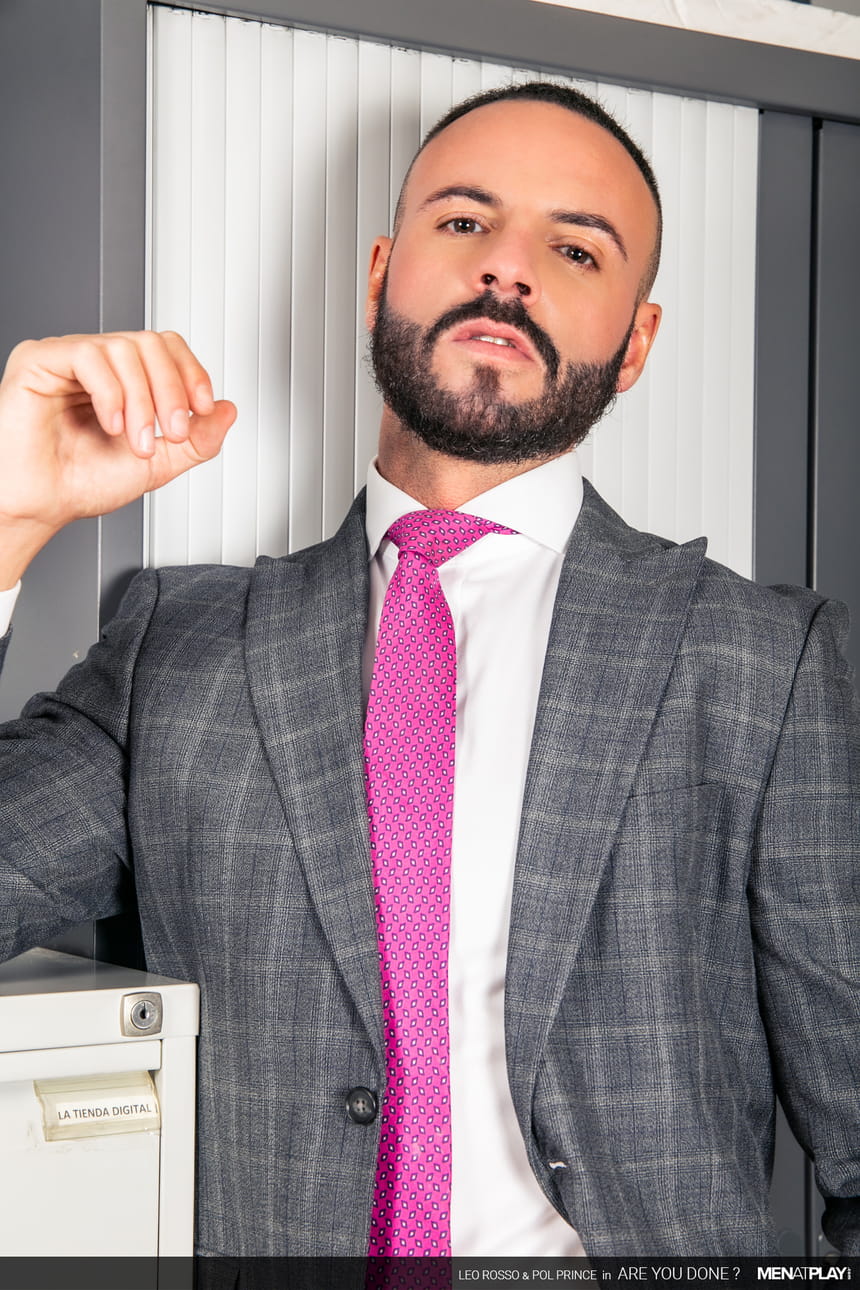 Pol Prince is the new guy at the office and today he’s working alone with manager Leo Rosso. Leo asks Pol to go to the warehouse and do the inventory. While he’s working downstairs, Leo is upstairs watching him, getting horny, and enjoying the view of the young, bearded sexy stud.