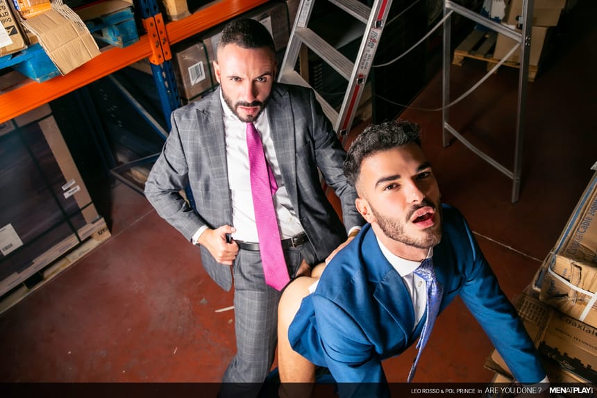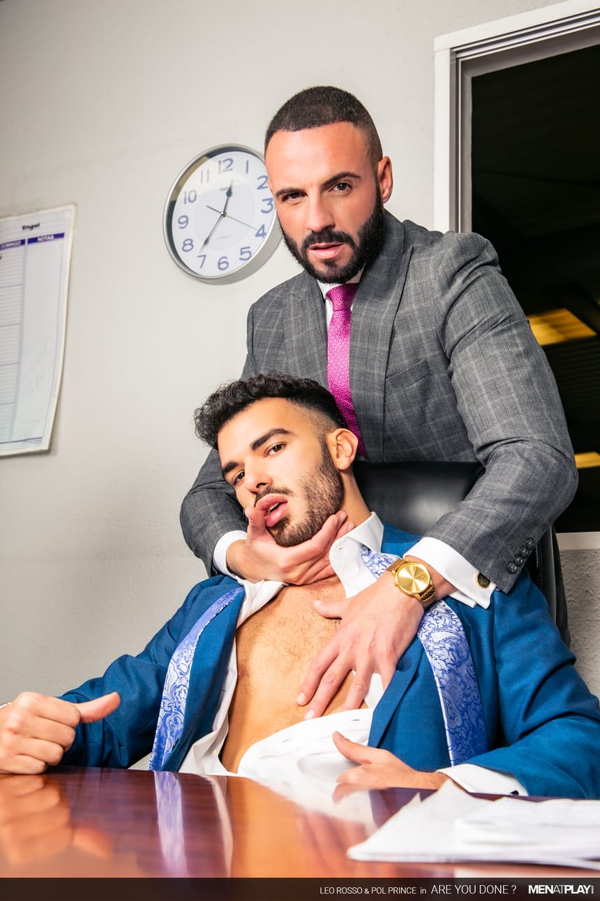 While Leo denies everything – Pol knows and likes what he saw! He likes them big and wants to taste and ride the boss’ thick cock. Leo wants to work less and play more too – the two suited studs flip-flop fuck in the warehouse.