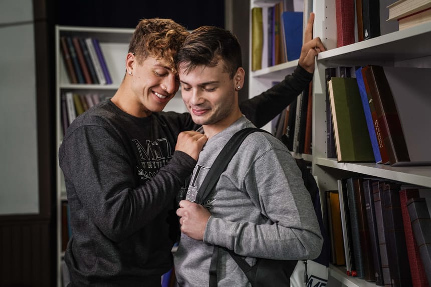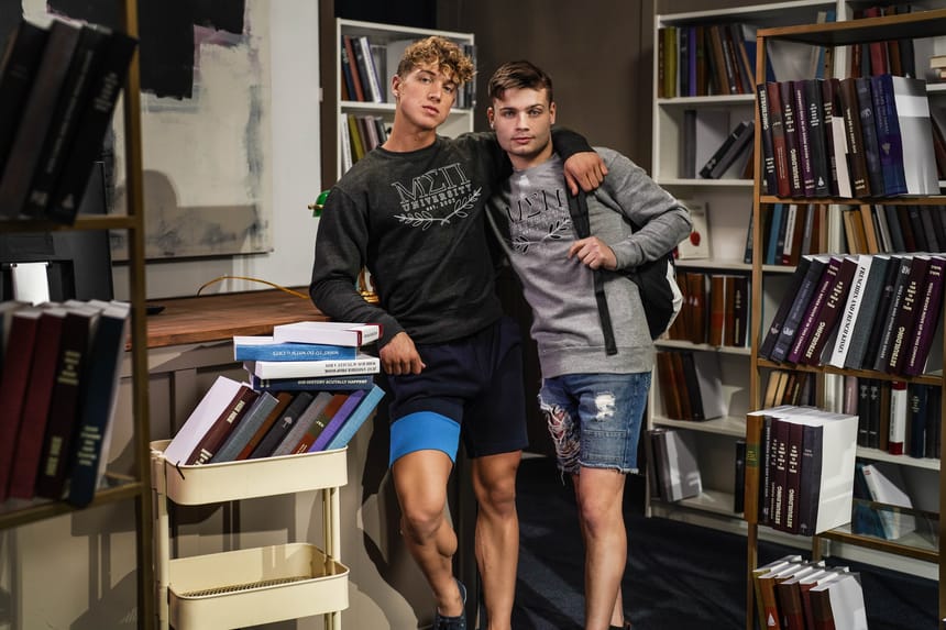 Felix Fox fucks Ryan Bailey and cums in his face in the third part of the Men.com series “Magna Cum Load“. Ryan is trying to get some studying done at the college library, but his buddy Felix is more interested in checking out the stern librarian.