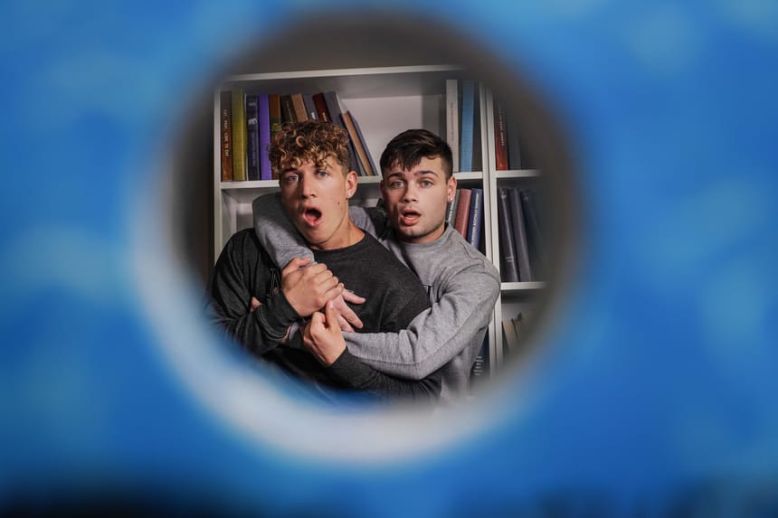 Felix Fox rubs his cock through his pants and makes dirty jokes. Felix takes out his dick and puts it through a hole he made in his book, then Ryan Bailey sucks it under the table. Next, Felix sneakily penetrates the bottom, but the pair get caught!