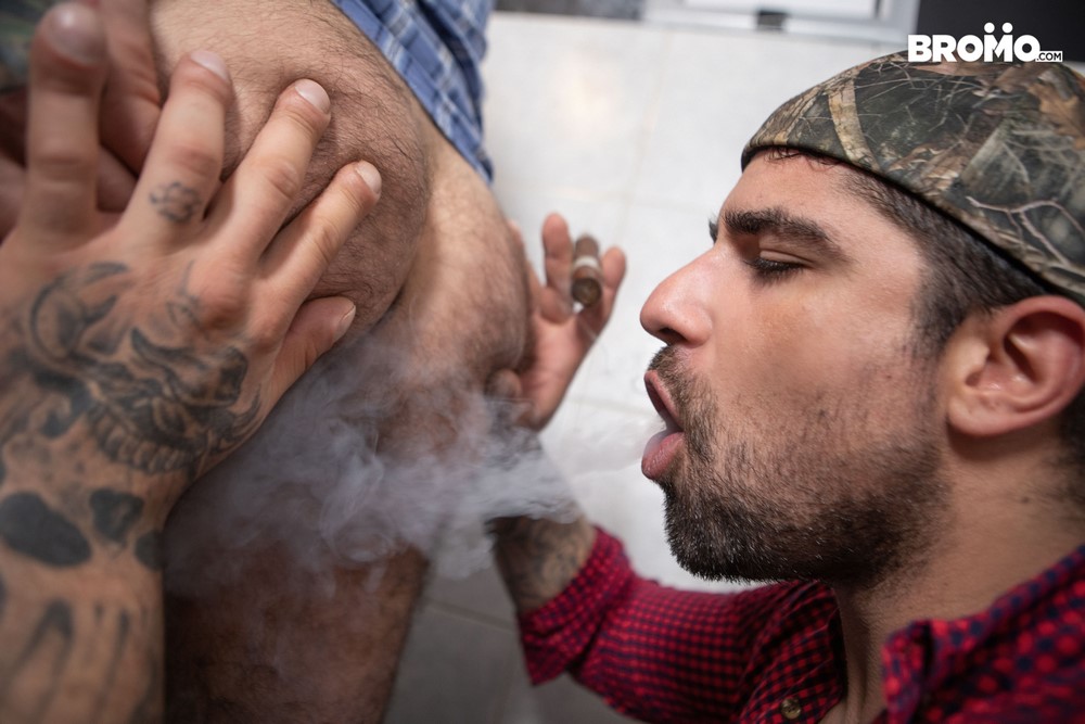 As trucker Ryan Bones is sitting outside his rig, puffing on a stogie, he sees Markus Kage walking around looking for a ride. He eyes up the tattooed stud and leads him into the bathroom, where Markus gets a good look at Ryan’s thick cock, then pushes him up against the wall and sucks it.