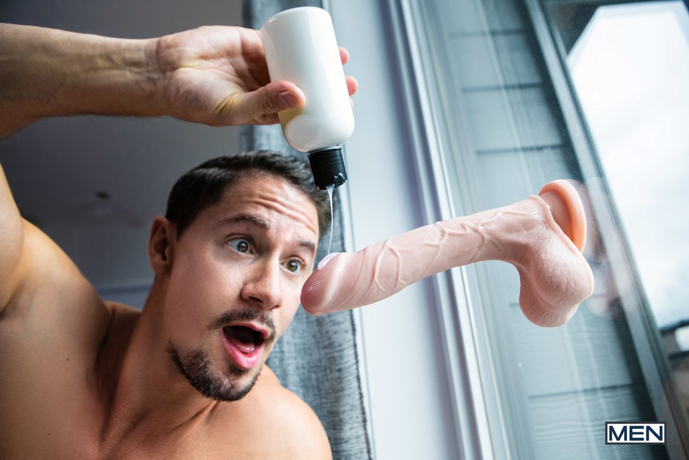 This Men.com release is called “Hole Stretching Service“. Professional hole-stretching specialist Ryan Bones is out for a jog when he spots Skyy Knox trying – and failing – to back his ass onto a dildo in his window. Ryan goes in for a closer look, then offers his assistance.