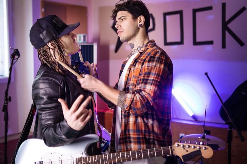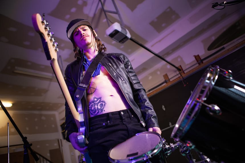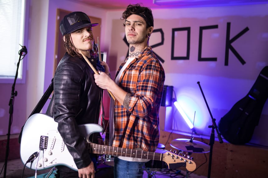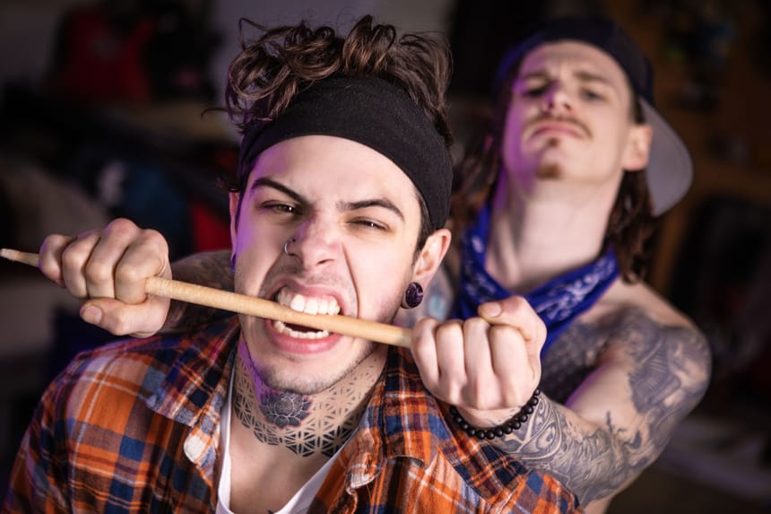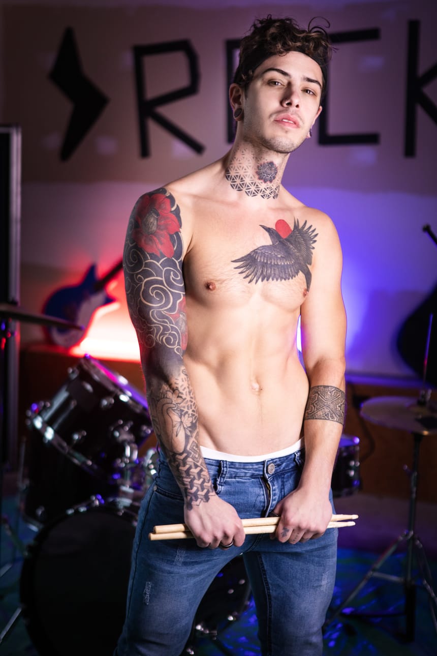 Guitar-slinging rocker Sunny D gives rehearsal his all, so he wishes drummer Dex Parker would do the same. When Dex rolls in to practice late with a bad attitude, the frontman has to show him who’s boss, putting his junk on Dex’s skins, then pulling down the drummer’s jeans and slipping a drumstick in his hole!