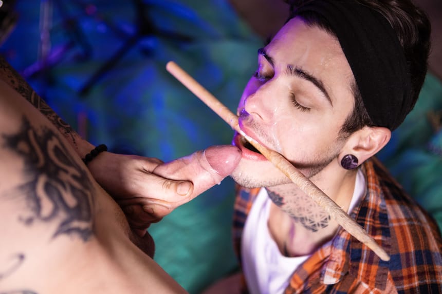 Sunny sucks the bottom’s cock, then fucks his ass, teaching Dex a lesson in rhythm. Dex devours Sunny’s cock, then rides him reverse before taking that dick deep in piledriver. Sunny slides a drumstick between Dex’s teeth as he pounds him in doggy-style, and when Dex cums, Sunny pulls out for a solo finish on his face!