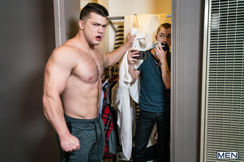 Theo Brady is shocked to find a suggestive pic of himself in his stepbro’s bedside table before he hides in Collin’s closet. Collin Simpson takes a post-gym selfie and then lies down on the bed to jack off, until he notices Theo recording him!