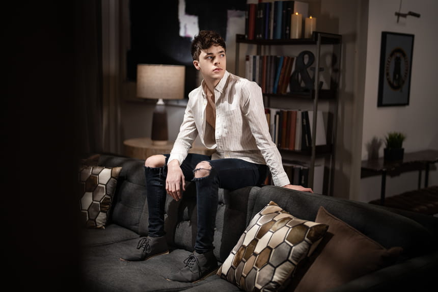 This scene is called “New Guy In Town” and marks the Men.com debut of porn newbie Troye Dean. Devy welcomes the pretty newcomer by running his hands down his chest and kissing him from behind as Troye sits on the couch.