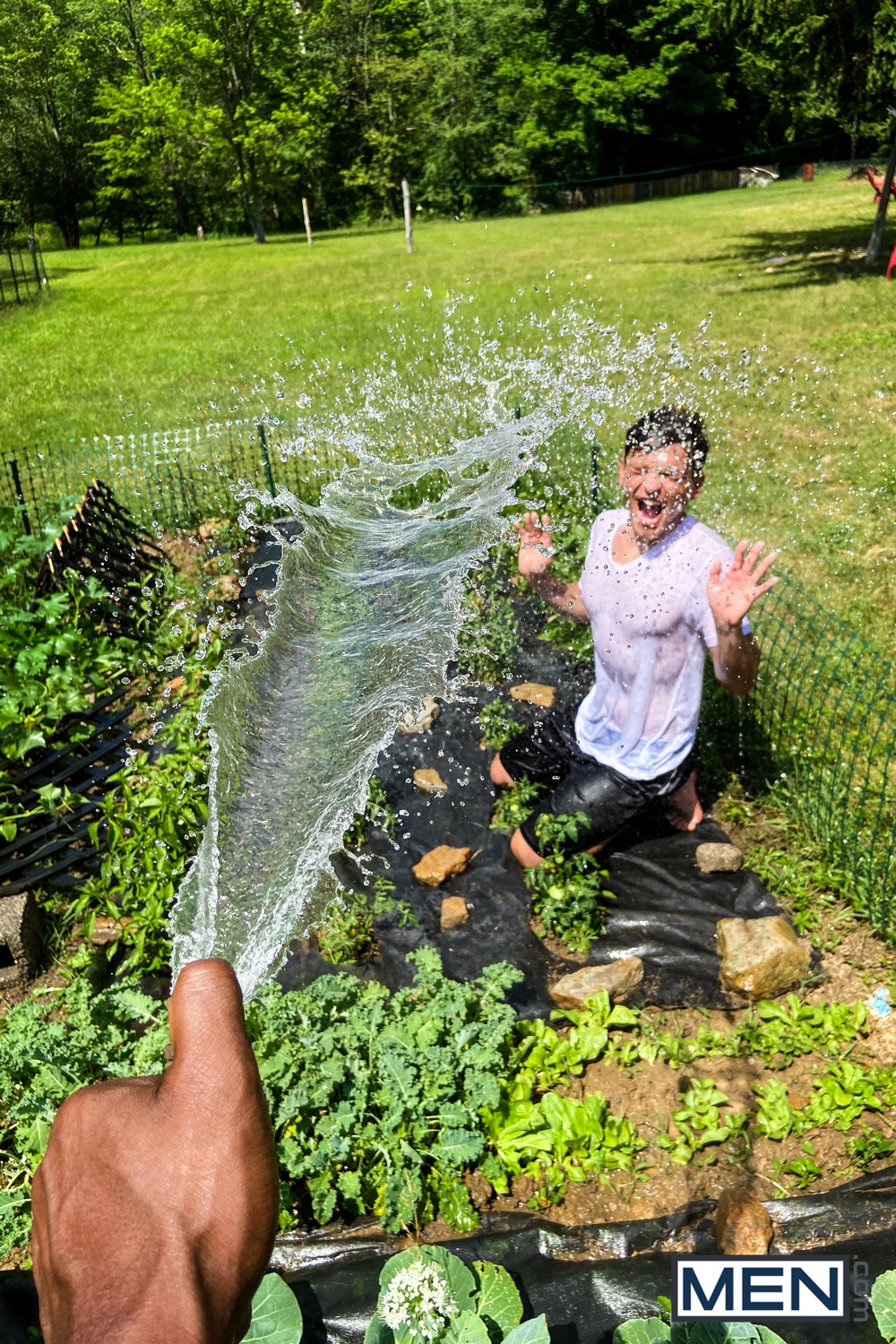 Bruno asks Ty for some help wielding the hose. However, Ty ends up soaking Bruno as much as the plants, so the gardener slips out of his wet clothes and spreads his ass as Ty watches, speechless!