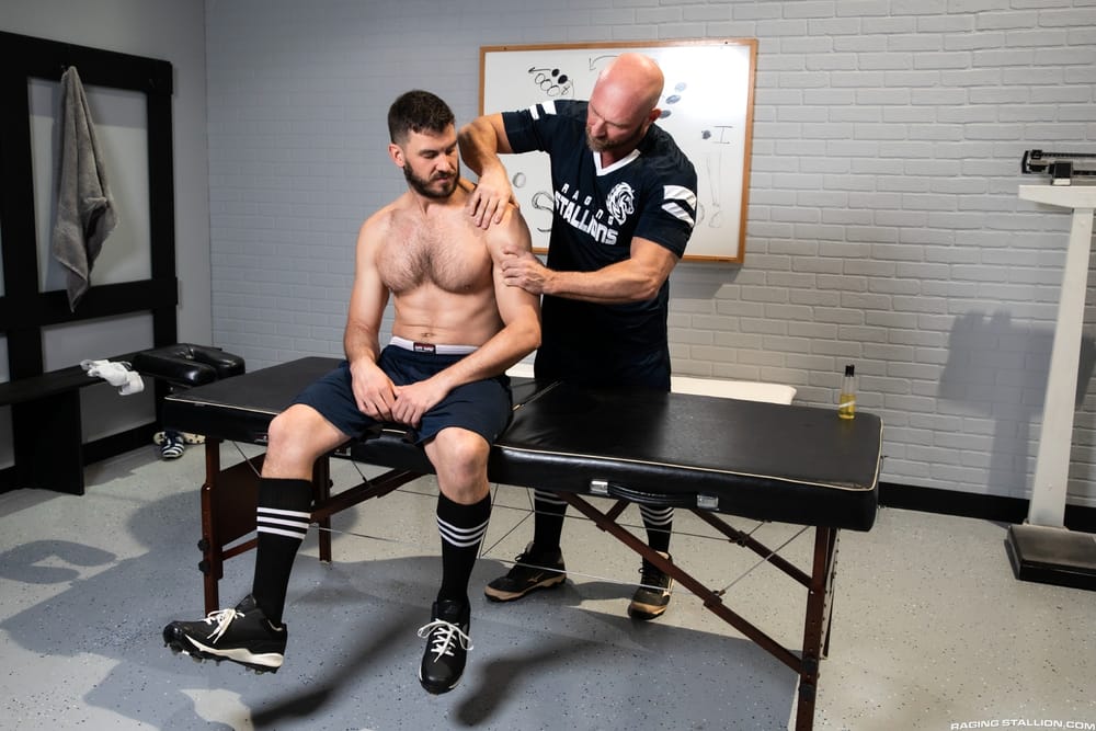 When Killian Knox is trying to help with Vander Pulaski‘s hamstring, he gets distracted by Vander’s hairy bubble butt framed by a hot jockstrap and decides to oil Vander up for a different kind of massage. When the jock comes off, Killian provides a massage with his tongue directly on Vander’s fuzzy hole.