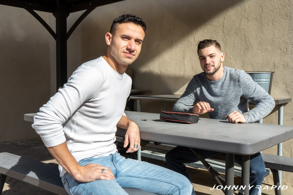 Next, Johnny’s excited to suck Vinny’s big cock before getting his ass nice and wet with his tongue. Johnny bends Vinny over the table to fuck him from behind, then Vinny rides that pornstar cock before the guys jack themselves off till they cum.